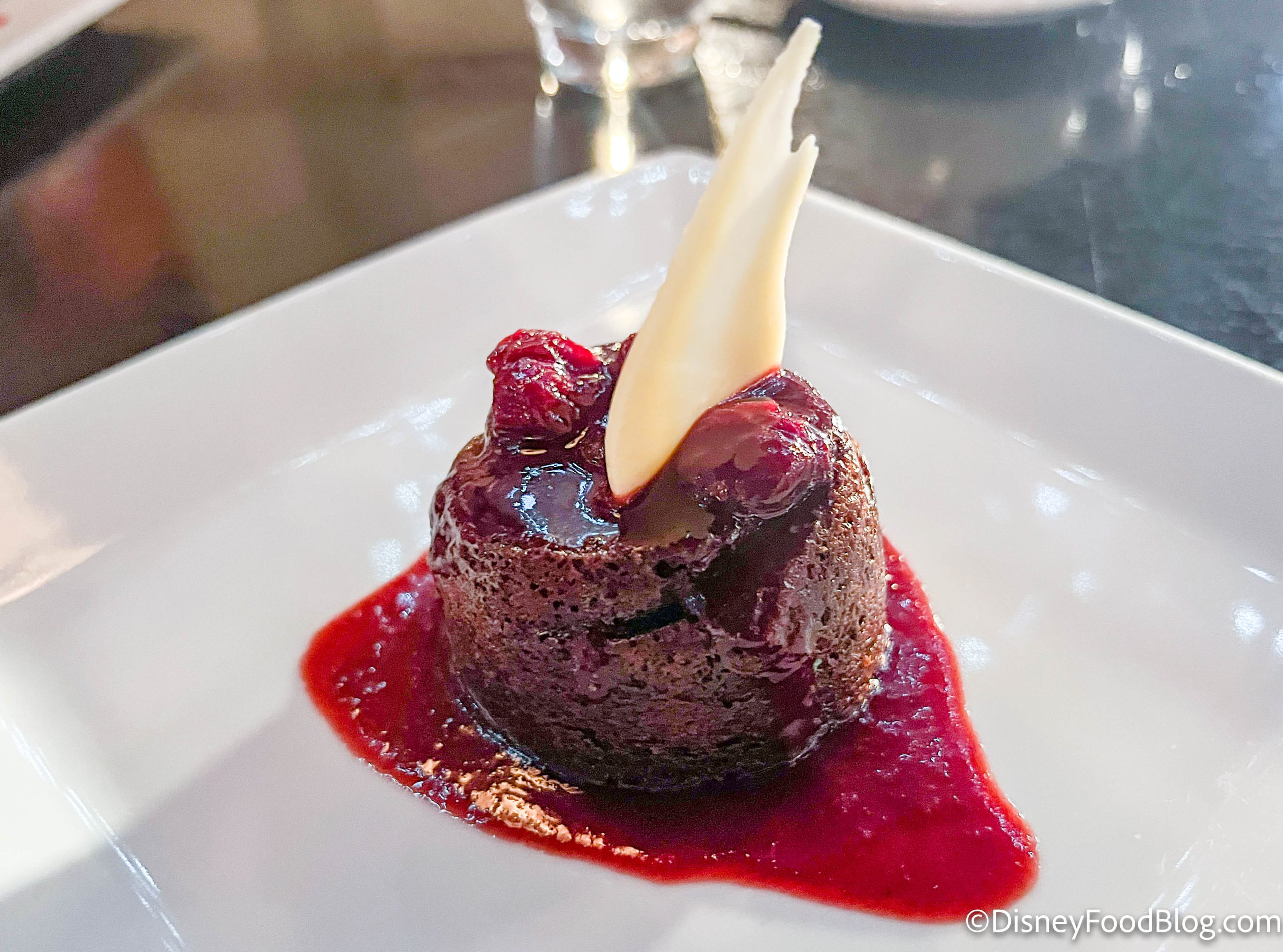 This is actually a plant-based chocolate cake served with a Morello Cherry-Pomegranate-Molasses Sauce.