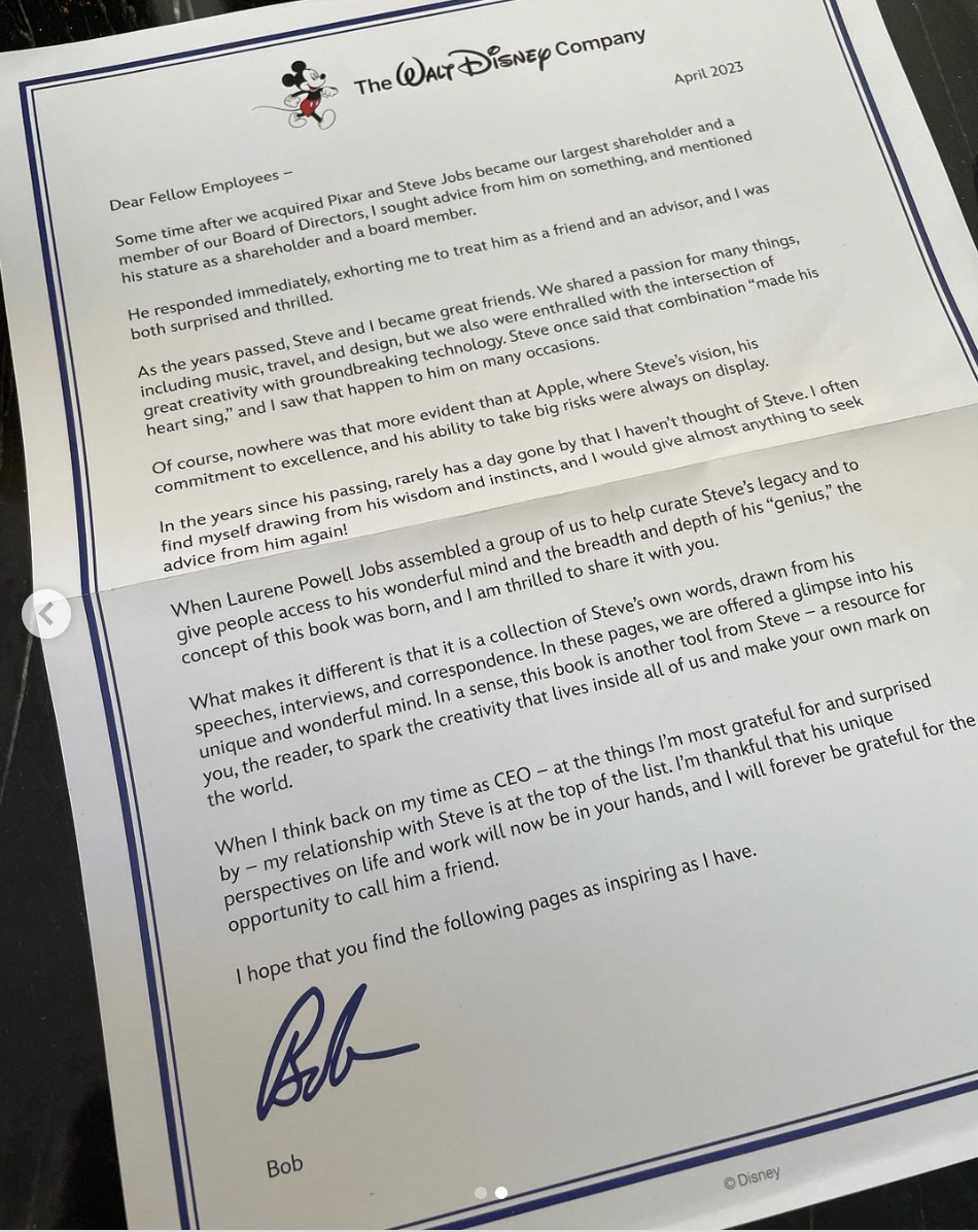 Iger recently even sent some Disney employees a Steve Jobs book — Make Something Wonderful, Steve Jobs in his own words. Michael Vargo, Vice President of D23, Special Events, and Disney Corporate Creative Resources, posted about this via Instagram.