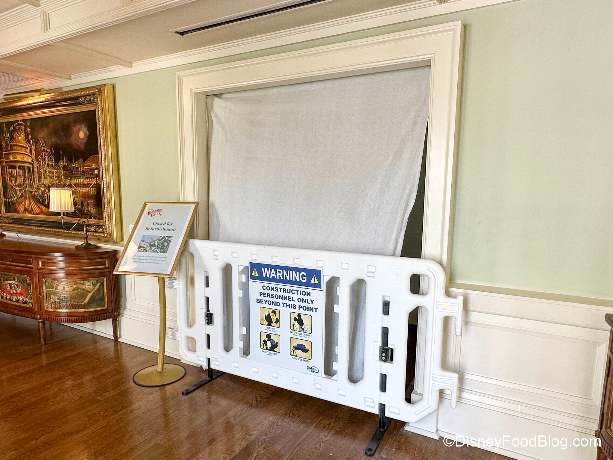 We learned that about half of the rooms at the BoardWalk Resort are completed (the ones on the farthest side). Disney hopes to have everything done by June and start refurbishing the villas after that. The lobby bathroom is also still under refurbishment.