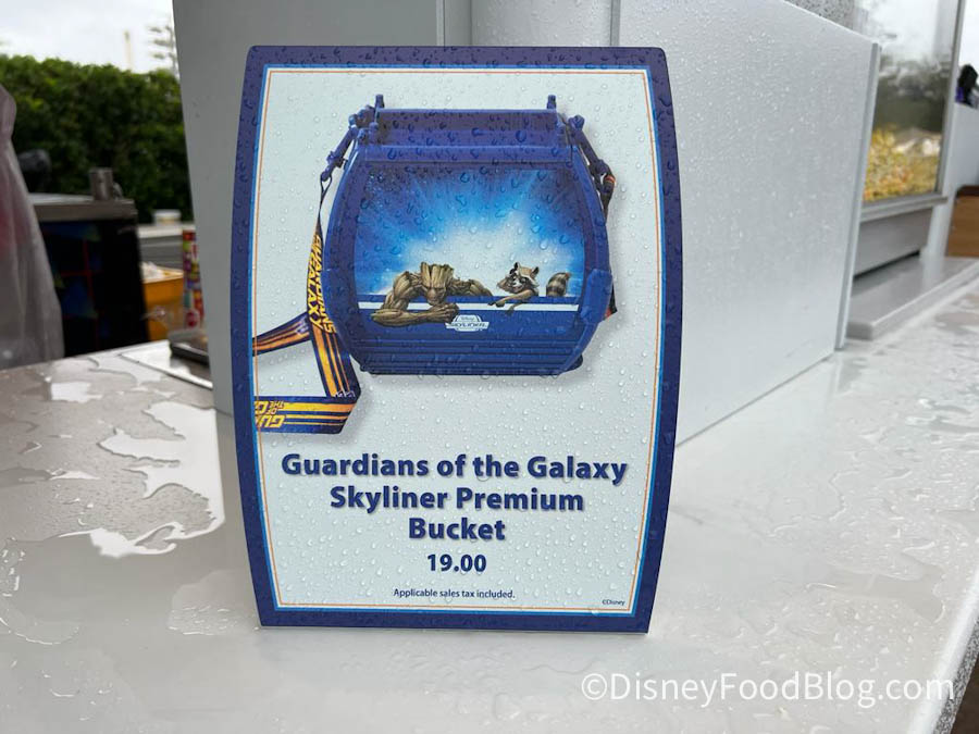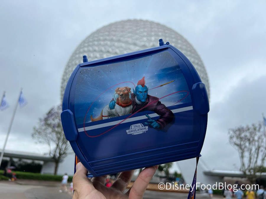 Well, now there’s a Guardians of the Galaxy Skyliner Popcorn Bucket. And it features our favorite band of Marvel misfits. It’s a dark blue popcorn bucket shaped like one of the Skyliner Gondolas.