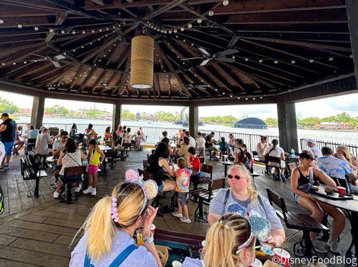 Evenings can be quite busy here, too…because the huge draw is the great view of the EPCOT fireworks and lagoon show. Sitting out here, over the water, with a taco platter and a margarita is basically the perfect EPCOT evening experience — and it’s cheap. But guess what. Everybody else knows it, too. So if you want your perfect seat for the fireworks, get here early!