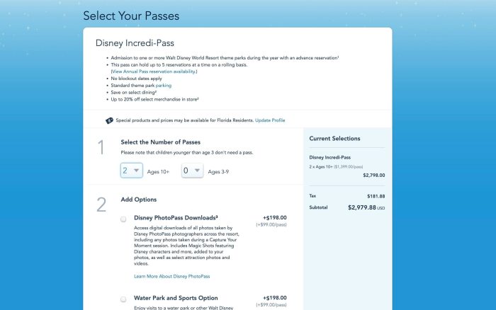 For those of our team who made it through the process, the purchasing steps don’t seem to have changed significantly. You’ll still need to choose your pass type, and then you’ll be directed to a screen where you select the number of passes, and your add-ons, and then connect those passes to people in your Family & Friends list. You have 10 minutes to go through the whole purchasing process once you make it out of the waiting room.