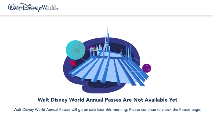 Disney World announced that annual passes would be available no earlier than 6AM Eastern time today, and so several of our team members were up before the crack of dawn to try and snag one. When we first pulled up the screen before 6AM, we got a message saying “Walt Disney World Annual Passes are not available yet” with a note to keep checking the passes page.