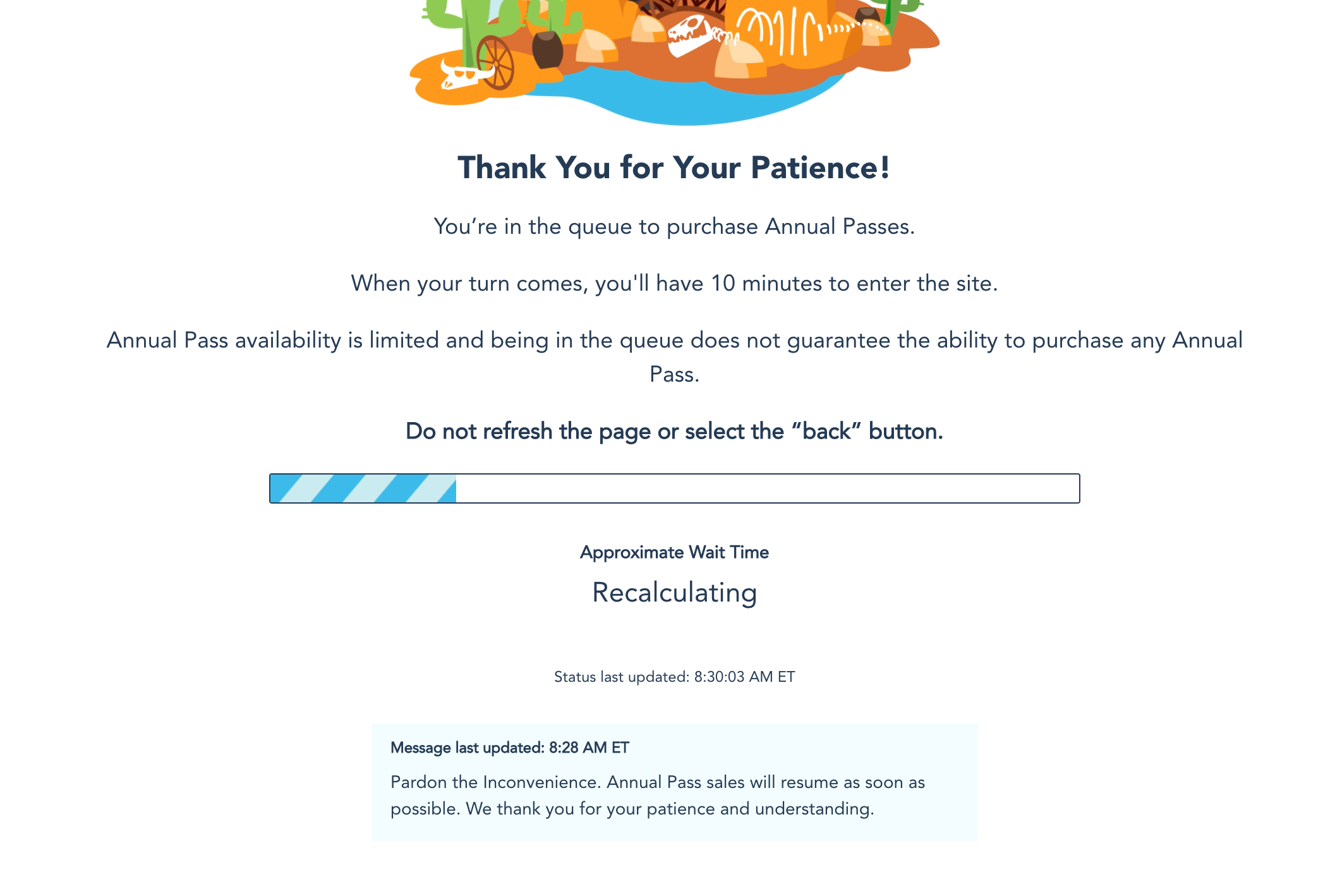 A few members of our team got to go through the process and purchase the passes, but those who were still waiting at 8:20AM ran into a new issue…the “recalculating” screen. Waits disappeared and we were all given a “pardon the inconvenience” message. Sales were paused for about 50 minutes before the estimated wait time screen returned.