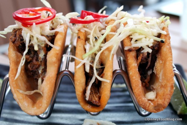 It’s time to stop by an outdoor lounge that deserves a little more love: Trader Sam’s Tiki Terrace. Attached to Trader Sam’s Grog Grotto, Tiki Terrace has the same menu that Grog Grotto has — but it’s just OUTSIDE. While you’ll miss the immersive elements indoors, this outdoor terrace is a wonderful place to find a last-minute place to hang out and chill. Then, order the Kalua Pork Tacos!
