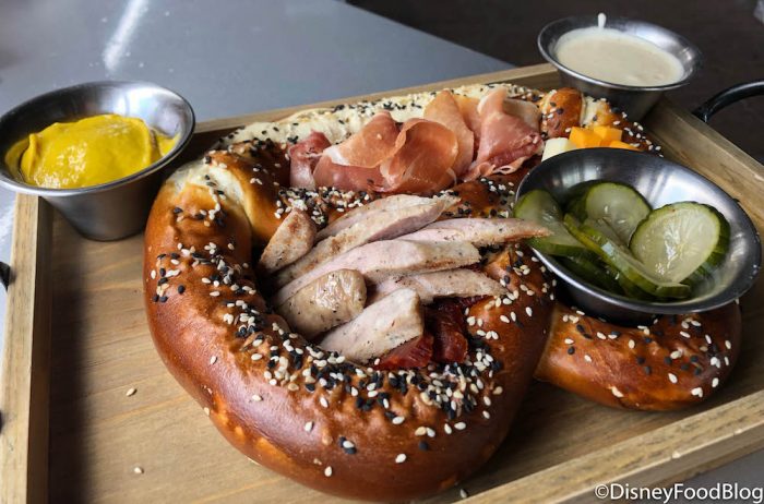 Jock Lindsey’s Hangar Bar in Disney Springs may specialize in cocktails, but they’ve also got quite a few lounge bites on their menu too. And if you want a lounge bite that could be considered more of a lounge CHOMP, then I’d recommend ordering the Air Pirate’s Cargo Loaded Pretzel. We recommend sharing this massive snack with a friend or two.