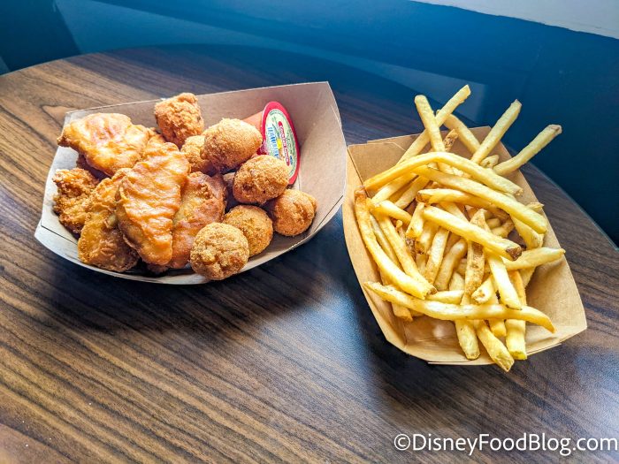 Enjoy some New England-inspired surf-and-turf at Columbia Harbour House in Magic Kingdom’s Liberty Square! The Trio Platter is a combination of Three Fried Shrimp, Two Chicken Strips, and Two Pieces of Battered Fish served with Hushpuppies and choice of Side.