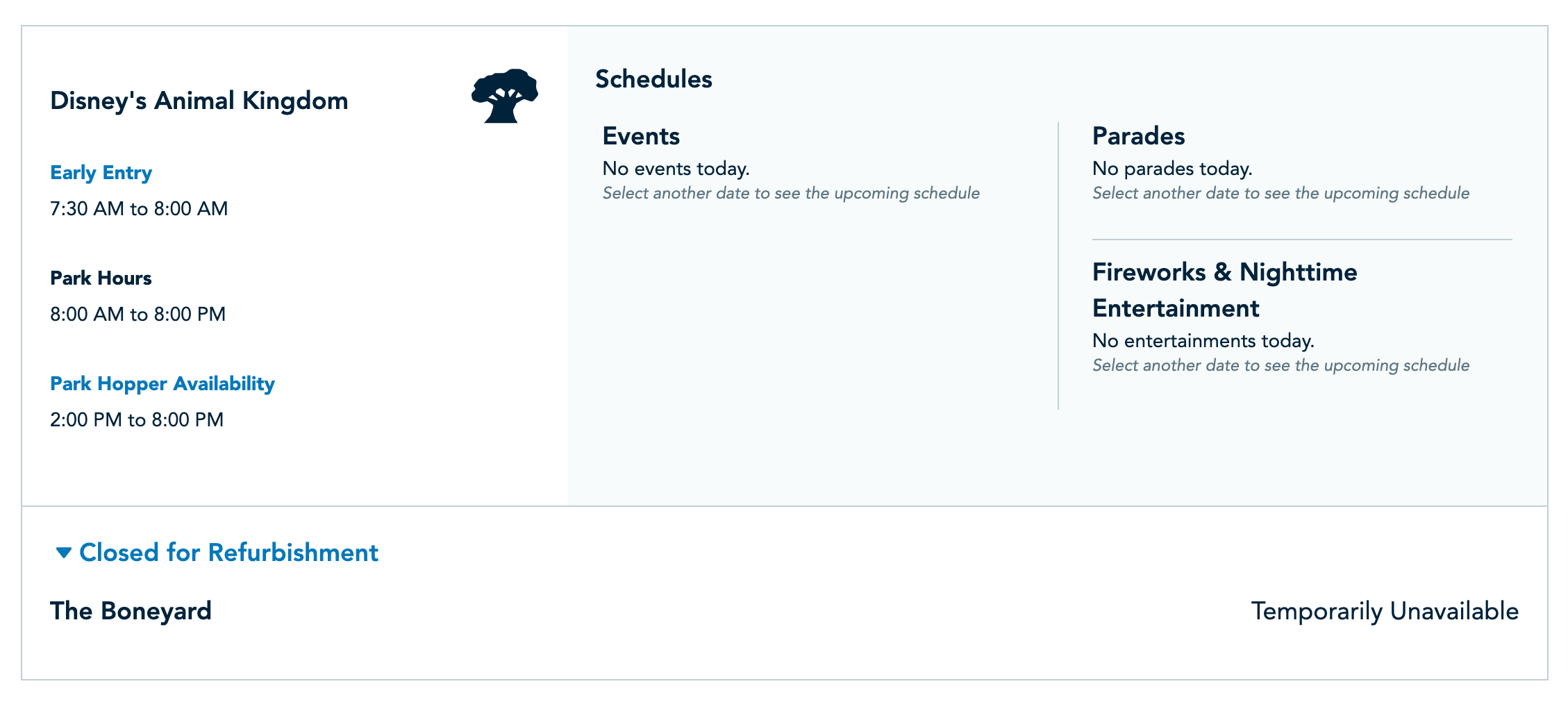According to the Disney World website, it looks like The Boneyard at Animal Kingdom will be closing for refurbishment soon. The refurbishment is listed on the day calendar, and all hours have been removed from the attraction’s page from May 1st-June 12th, 2023.