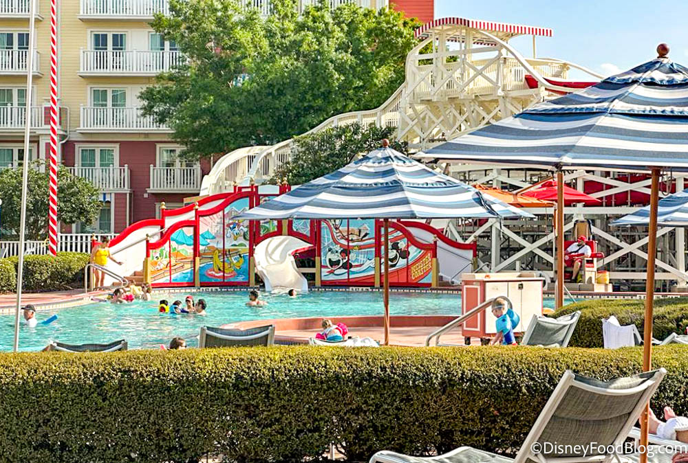 When the weather is HOT or you just need a break from park queues, head to your resort pool! After all, the pools have their own unique features and special theming. Feature pools at Walt Disney World hotels usually have at least one slide and also offer poolside activities. Look at the hotel’s recreation schedule for more information. Some Disney resorts are so spread out that they also offer leisure pools. These swimming spots are family-friendly with at least one whirlpool spa. Leisure pools are quieter than the more crowded and active feature pools.