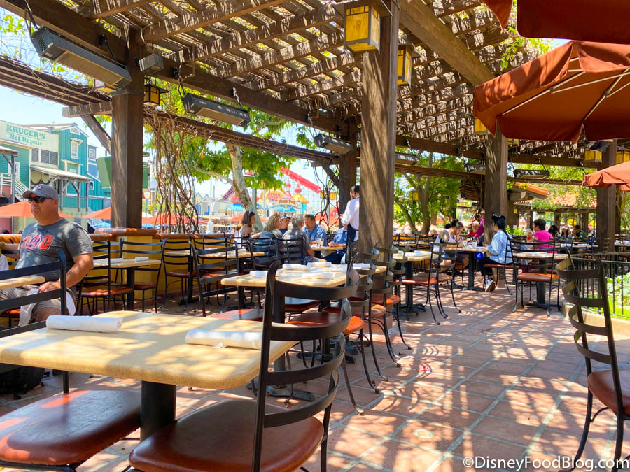 We were at DL/CA for our one and only trip there in February (yes, just in time for the heavy rains). We eat mostly QS, with our only TS meal with friends at Wine Country Trattoria. Let me say it is not really the best place for children, although they do offer children’s selections. Everyone in our group was surprised by what our choices looked and tasted like, and not always in a good way. The tomato soup was interesting, not creamy but herby. The chicken was a small Cornish hen on a puddle of seasoned potato, okay but my son was left hungry. I tried the flatbread, which the server warned was spicy. She was right, but I remedied that in part by removing the excessive number of jalapeno rings strewn on top. The Caesar salad turned out to be small bunches of romaine lettuce charred with dressing. It was actually good, which I know because two people got it and there was plenty to share around the table. None of these things are on the current menu, so it may be seasonal as to what they serve. The newer menu, with things like vegetable lasagna and chicken parmesan, would have suited us better. Note that all seating is “outdoors,” even the covered seating. While they had heaters, many of us were pretty cold. The service was very good.