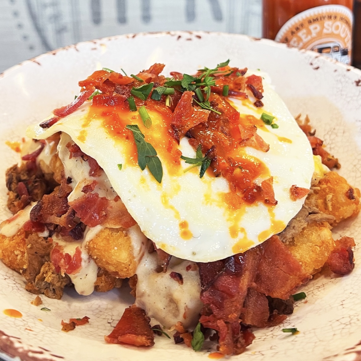 The Southern Poutine is made with crispy tater tots smothered in pulled pork and sawmill gravy and topped with a fried egg and a bacon crumble.