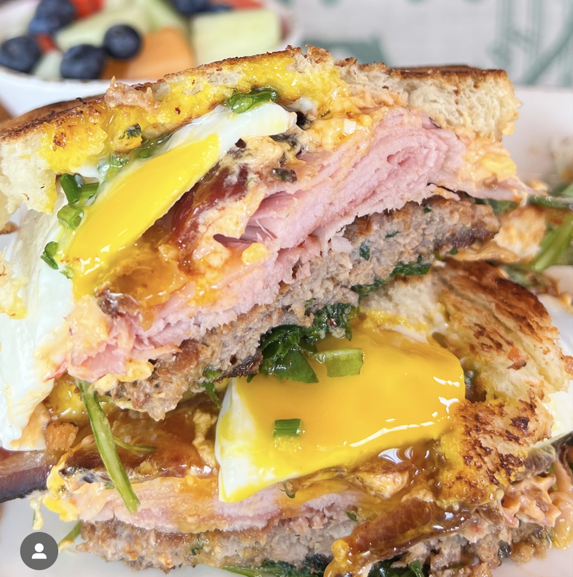 The Ultimate Breakfast Sandwich is a maple pork sausage patty, crispy bacon, country ham, melted pimento cheese, bacon jam, and a fried egg between two slices of toasted sourdough.