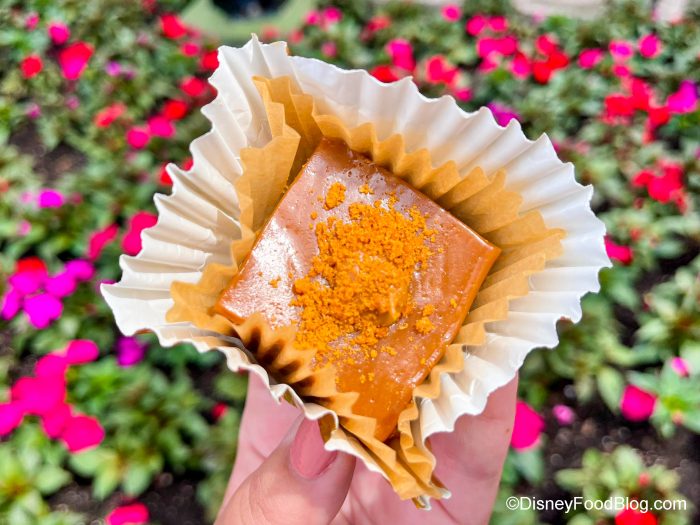 Over in EPCOT is one of our FAVORITE spots to get a snack, Karamell-Küche. We’re suckers for the Caramel Popcorn, the Gingerbread Salted Caramel Buttercream Cookie Sandwich, and the Caramel Butter Bar there. Well, a NEW treat is now available, the Werthers Original Caramel Cookie Butter Caramel Square (yes, caramel is in the official name twice!) for $4.49.