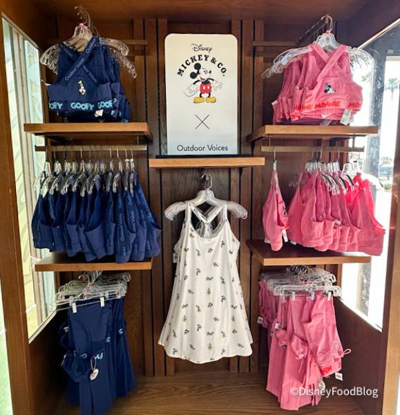 If you’re a fan of Outdoor Voices, or if you’re looking to give the brand a try during your next park trip, you’re in luck, because Outdoor Voices and Disney just dropped a collaborative collection together — and it’s available in the parks AND online. We first noticed the collection when we walked into Port of Entry at EPCOT and saw this sign, explaining the mission behind the collection. How cute is this?