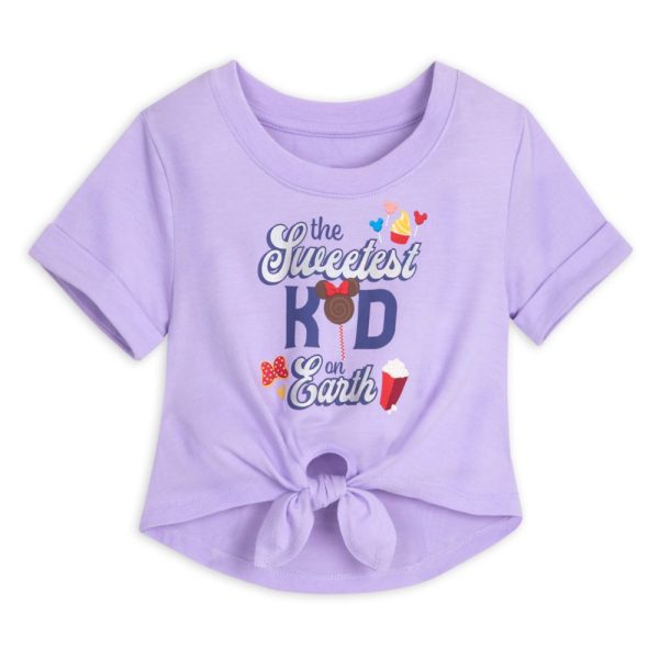 Okay, so this might be our favorite Disney Mom shirt ever because it’s got food all over it. It’s the Sweetest Mom on Earth Shirt. This purple shirt is covered in Disney snacks and has a tie front.