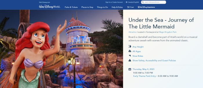 For example, on May 4th Under the Sea – Journey of The Little Mermaid in Magic Kingdom was set to close EARLY — at 7PM. That’s four hours before Magic Kingdom closes at 11PM.
