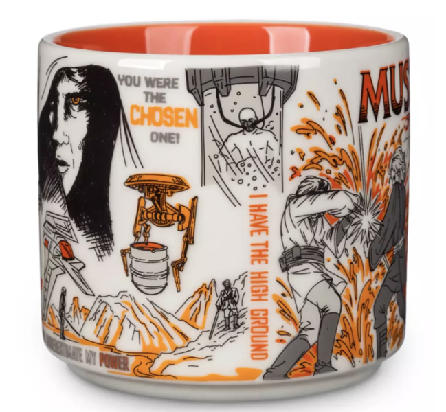 The main colors of the mug are orange, gray, and black, and feature imagery of Mustafar — where Anakin Skywalker became Darth Vader. One of the best parts of this mug is the fact that it includes Obi-Wan Kenobi’s iconic line: “I have the high ground.”
