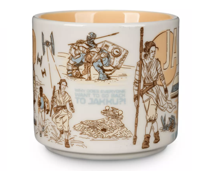 This mug features a blue, orange, and brown colorway and features scenes from Jakku, the remote desert planet on the “outer reaches and beyond.”You’ll see quite a few fan-favorite characters on this mug, including Rey, Finn, and even BB-8.