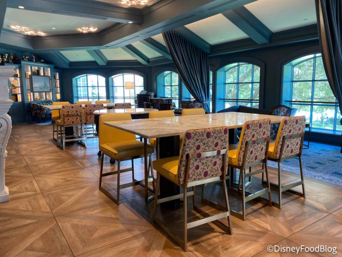 Finally, The Library is inspired by the great library in the Beast’s castle. The Library is a large room with a lot of seating, and we found it to be very comfortable and inviting. There are two large bar tables that can seat parties of 6.