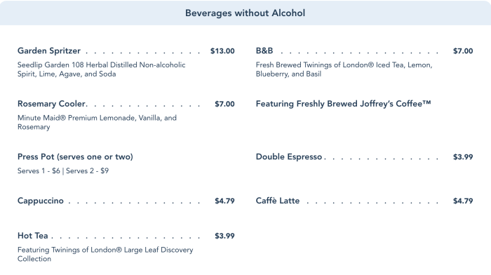 If you are looking for something without alcohol, they are a few mocktails, as well as coffee and tea.