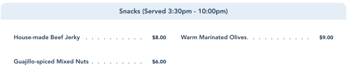 The lounge serves snacks beginning at 3:30 PM. These include house-made jerky, marinated olives, and guajillo-spiced nuts.