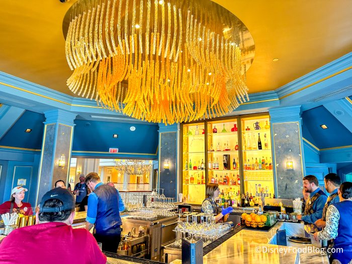 The lounge features four different rooms, each of which has been inspired by a different iconic Beauty and the Beast element. First is the bar area. This room centers around the large bar beneath a gold chandelier that was inspired by Belle’s dress.