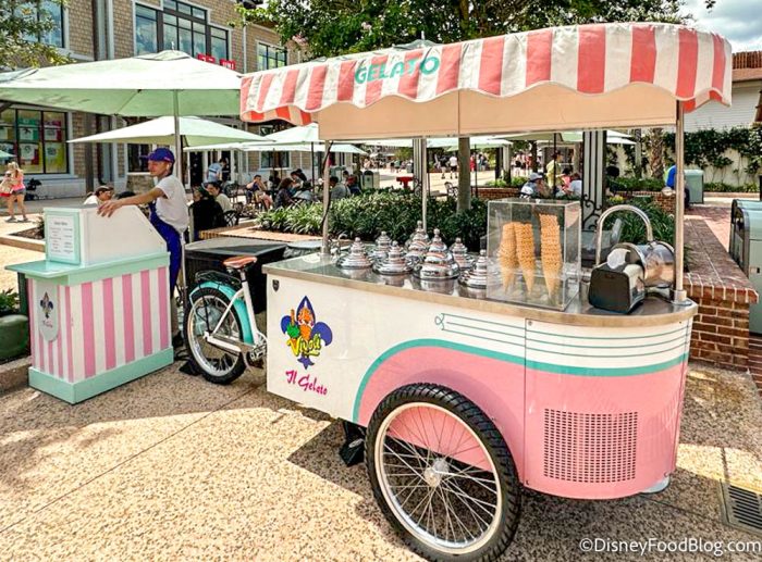 While walking by Muppets Courtyard, we noticed that the Vivoli Gelato Grand Avenue Gelato Cart had an interesting daily offer weâd never seen before. There are featured flavors here that switch out periodically.