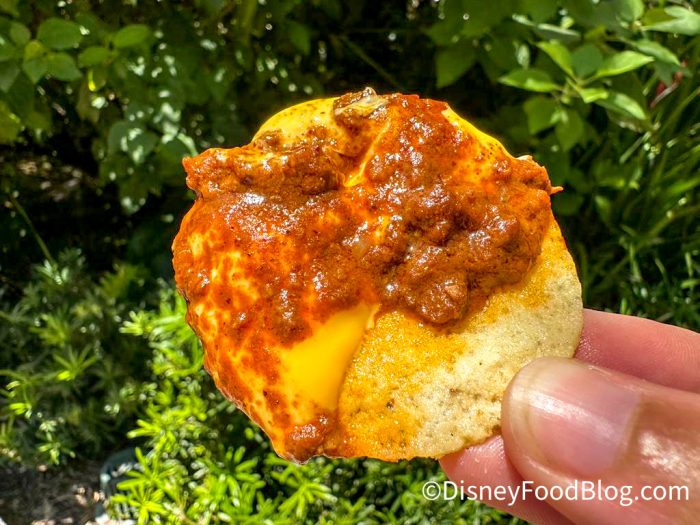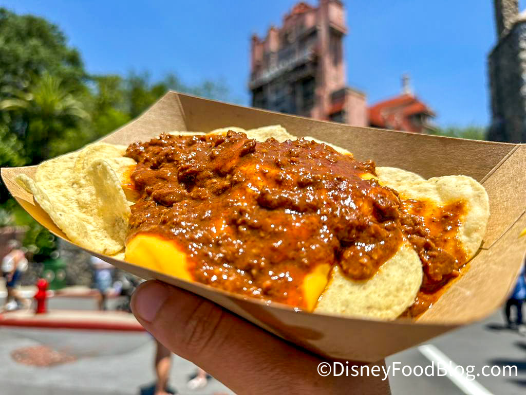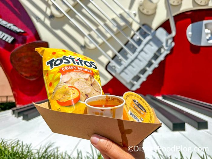 This is for all the chili cheese fans — today we’re introducing you to Hollywood Studios Chili Cheese Nachos! The first step is to grab some Tostito chips and the beloved plastic cheese from the KRNR Snack Cart close to Rock ‘N’ Rollercoaster. These will cost you $5.79.
