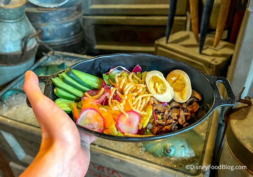 Over at Docking Bay 7, we tried the Temple Rootleaf and Moss Salad with Seasoned Gwayo Egg for $15.49. This thing has a LOT going on with it. is made with sweet-savory salad greens, brined vegetables, roasted mushrooms, fried potato noodles, and a soy-marinated soft-boiled egg. Yes, only adventurous eaters need to apply for this snack.