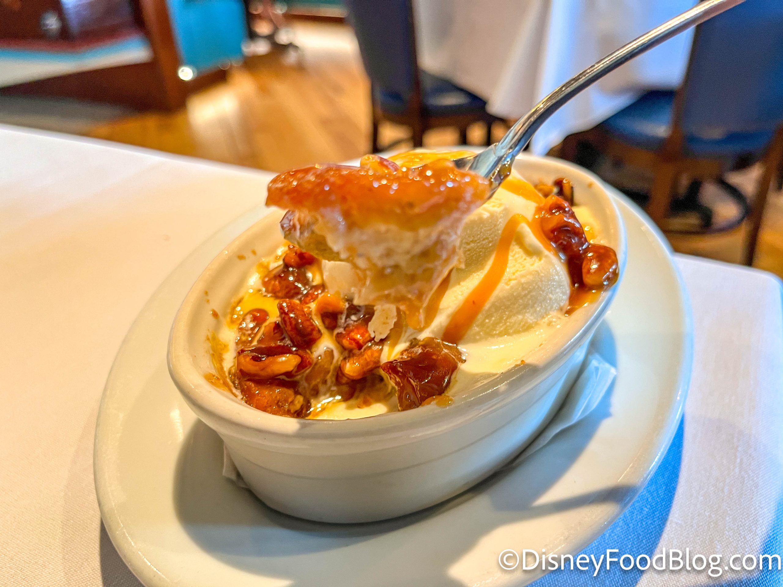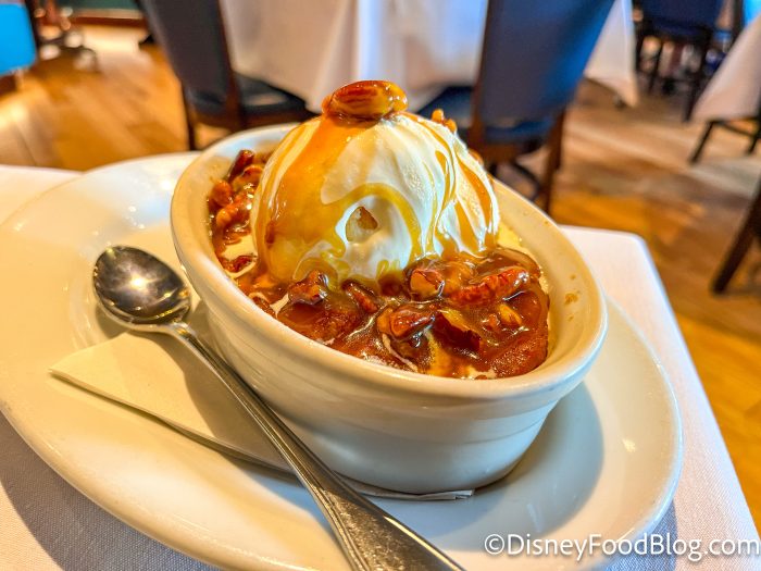 Finally, we arrive at dessert. As soon as I saw that they had Caramel Apple Bread Pudding on the menu, I knew I HAD to try it. (I’m a big bread pudding fan, and I’ve tried several different types across Disney World!) I ordered mine with the sauce on the side so that I could pour it over the dish to my liking.