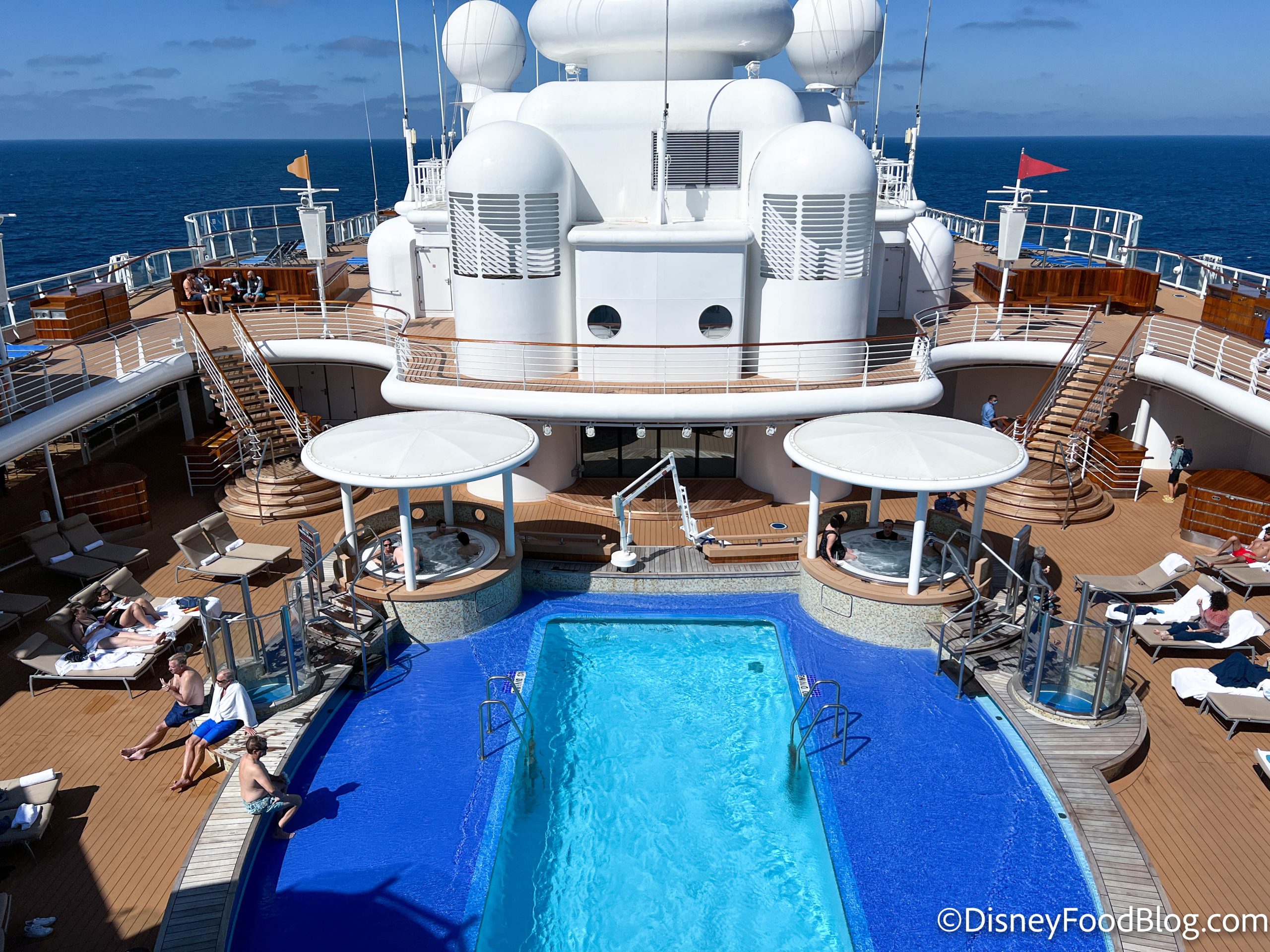 Things can be pretty overwhelming on Embarkation Day — especially if this is your first-ever cruise. So, if you don’t need to go to guest services for anything… what should you do first? Many guests will make a beeline to the food courts to get a head start on that all-inclusive dining. But if you’re not hungry yet, we’d recommend heading on over to the pools.