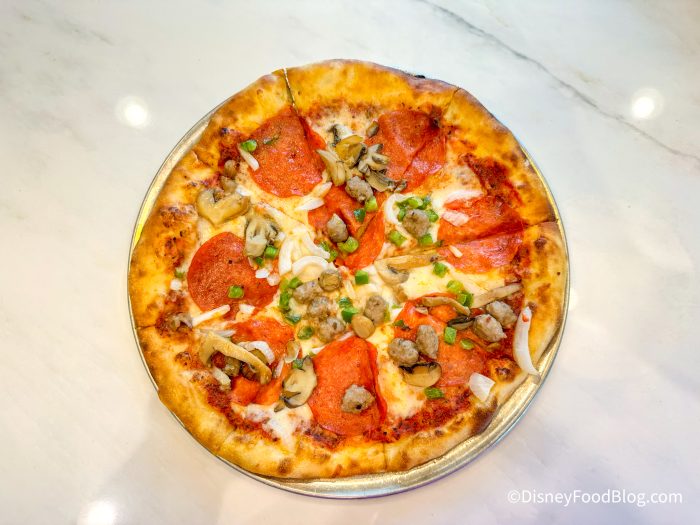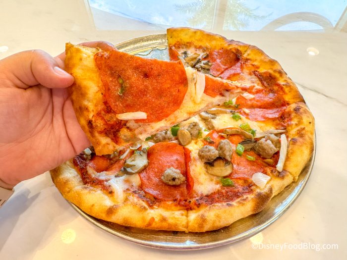 The crust was very thin and had a lot of garlic salt, which we liked. It didn’t quite have enough sauce on it, though, and we thought the pizza could have been cooked longer.