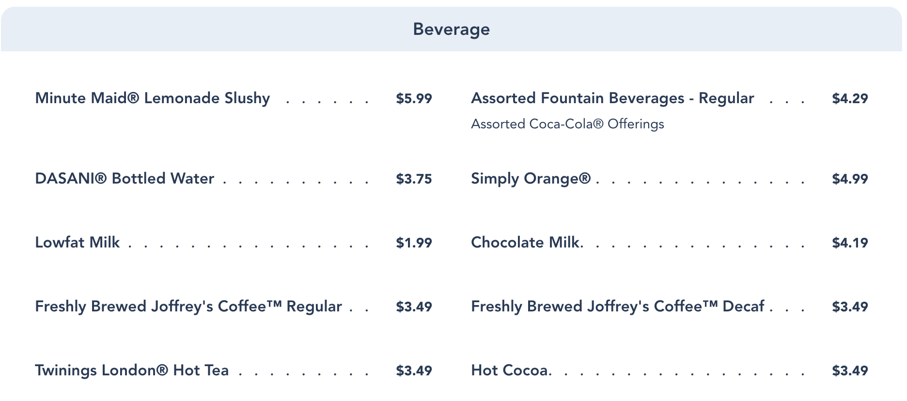 To drink, they serve a variety of soft drinks, coffee, milk, hot cocoa, and a lemonade slushy.