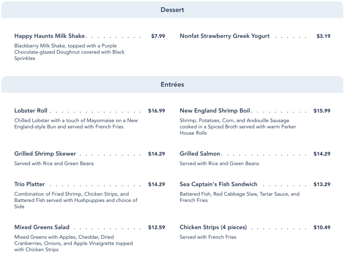 Listed first on the menu are the desserts! You’ll find a Happy Haunts Milk Shake and Yogurt here if you want something sweet. For entrees, the restaurant offers a number of seafood items, like a New England Shrimp Boil, a Lobster Roll, and the Sea Captain’s Fish Sandwich. If you’re not a fan of seafood, there are a couple options — a Mixed Greens Salad and Chicken Strips.
