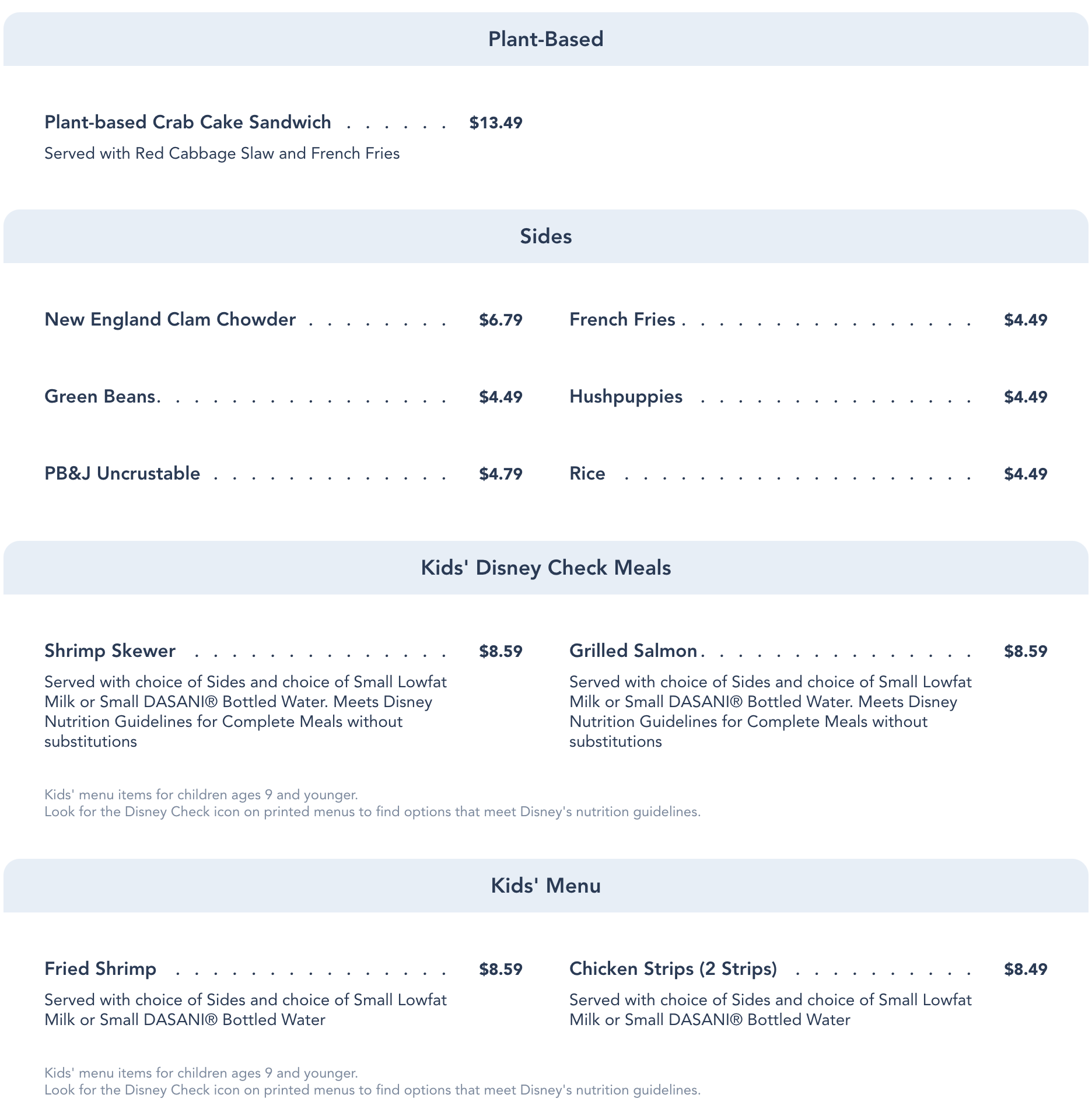 Next, you’ll see the Plant-Based Crab Cake Sandwich above a variety of sides and a few kid’s options. For the little ones, you have a choice between a Shrimp Skewer, Grilled Salmon, Fried Shrimp, or Chicken Strips.