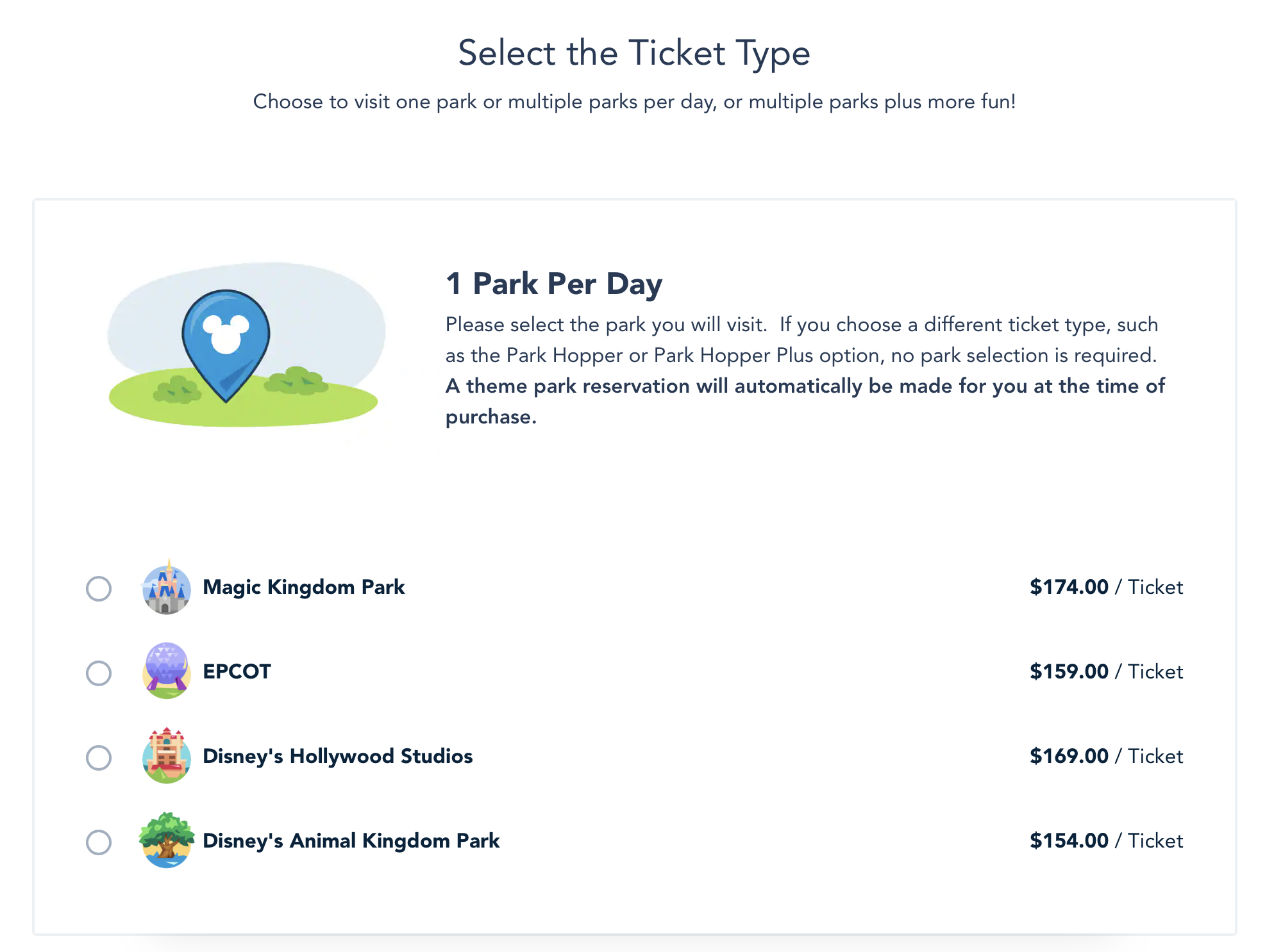 The 1-day, 1-park ticket prices for Memorial Day range from $154 to $174.