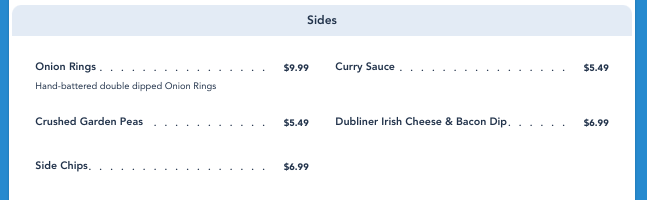 There are some sides to pick from including onion rings, crushed garden peas, chips, curry sauce, and the oh-so-cheesy Dubliner Irish Cheese & Bacon Dip (we’ll get to that in a second!).