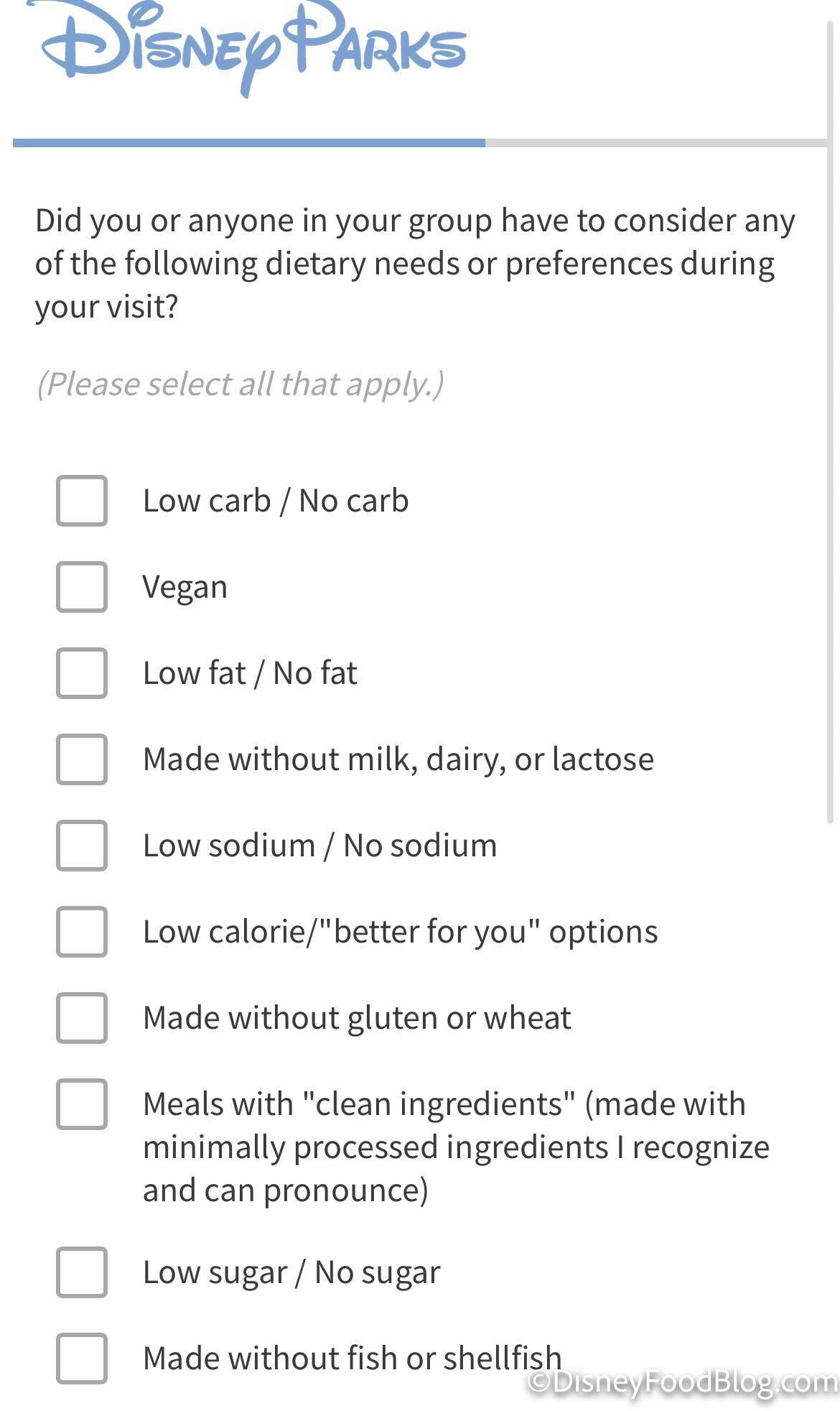 Disney is also interested in dietary needs or preferences, given the question below. If you will be visiting Disney World and have specific dietary needs or allergies, be sure to check those menus ahead of time and reach out to Disney’s special diets team with any questions or concerns.