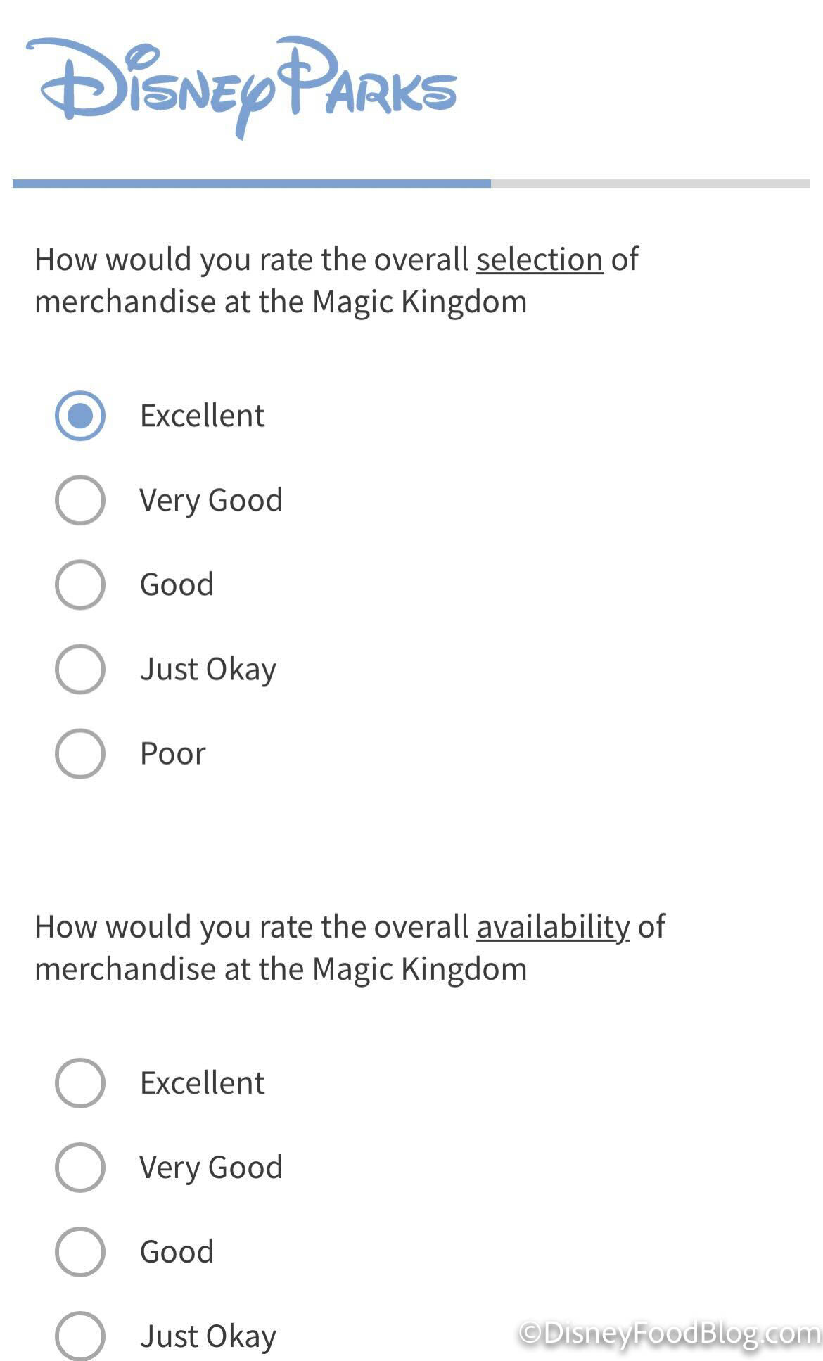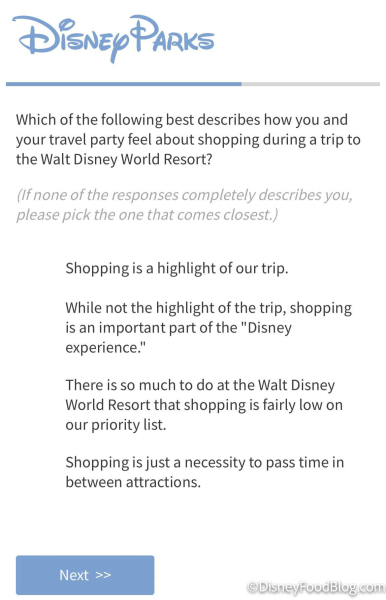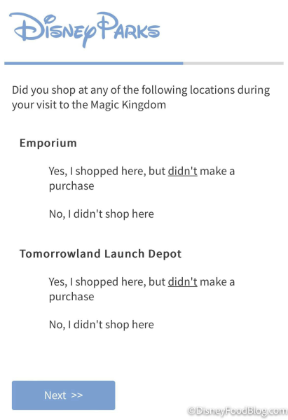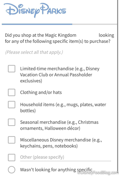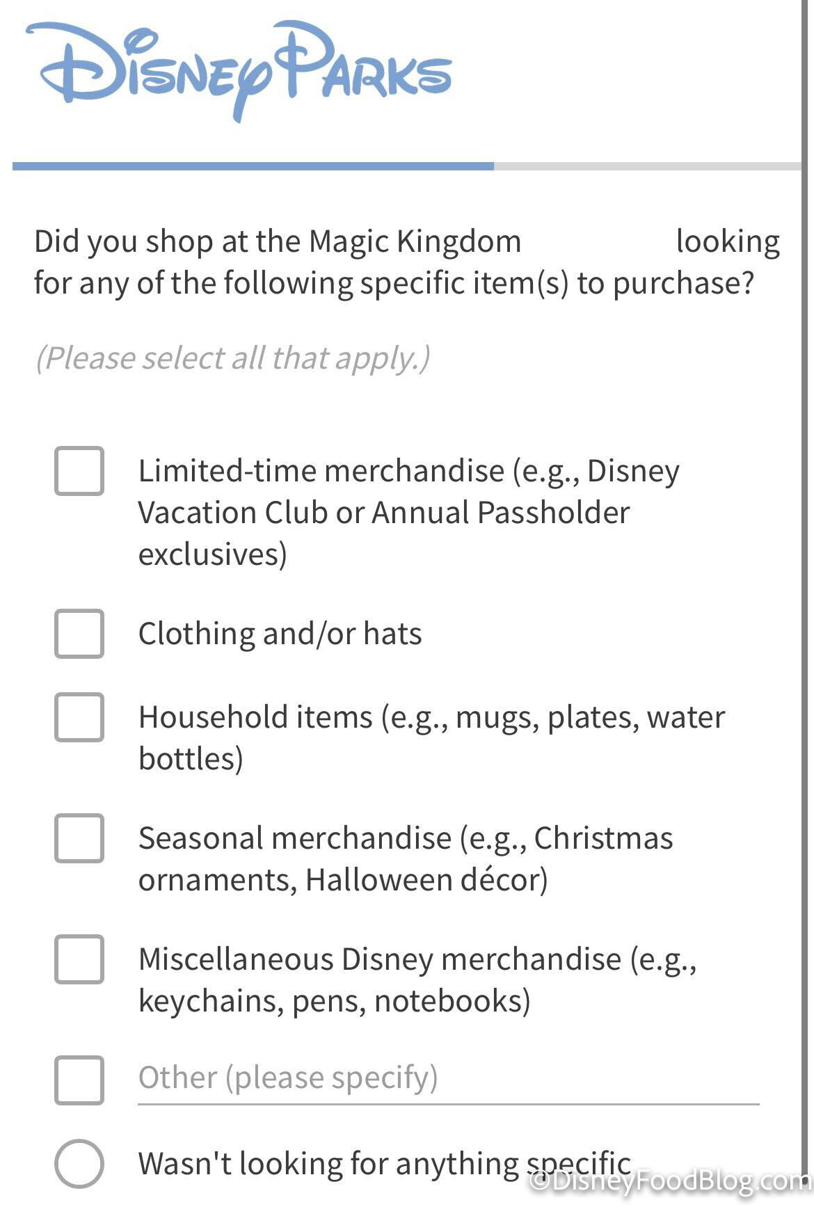 Disney also wanted to know what spots we shopped at — that can give them a better idea of just how many guests are frequenting the stores (matching survey data with other data they likely have) to understand the guest flow and where key merchandise might need to be placed to encourage purchases.