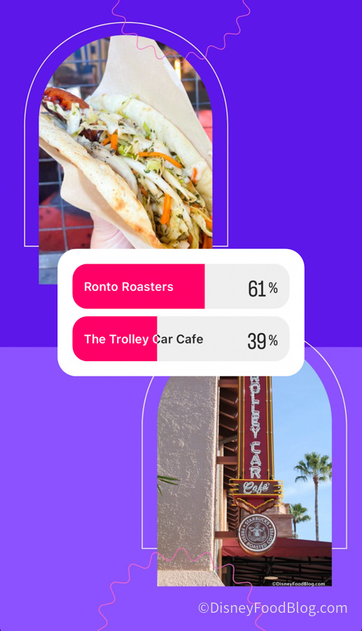 Next up, we’ve got Ronto Roasters up against The Trolley Car Cafe, both at Hollywood Studios.