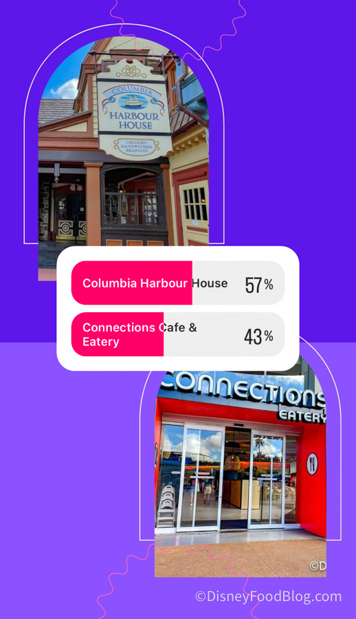 It’s another match of old versus new with Columbia Harbour House in Magic Kingdom against Connections Cafe & Eatery at EPCOT.