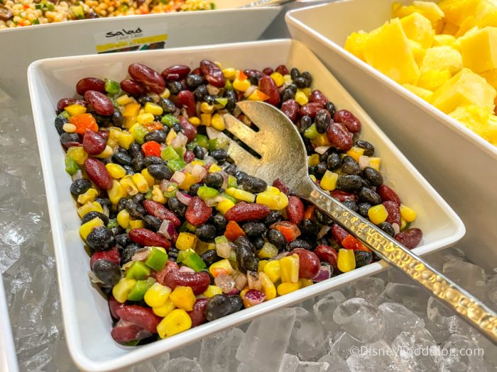 …plus a ton of delicious eats available during this buffet-style character meal! Pricing is $59 per adult and $38 per child during lunch and dinner. In the past, we’ve enjoyed the Cowboy Caviar-esque cold Bean Salad…