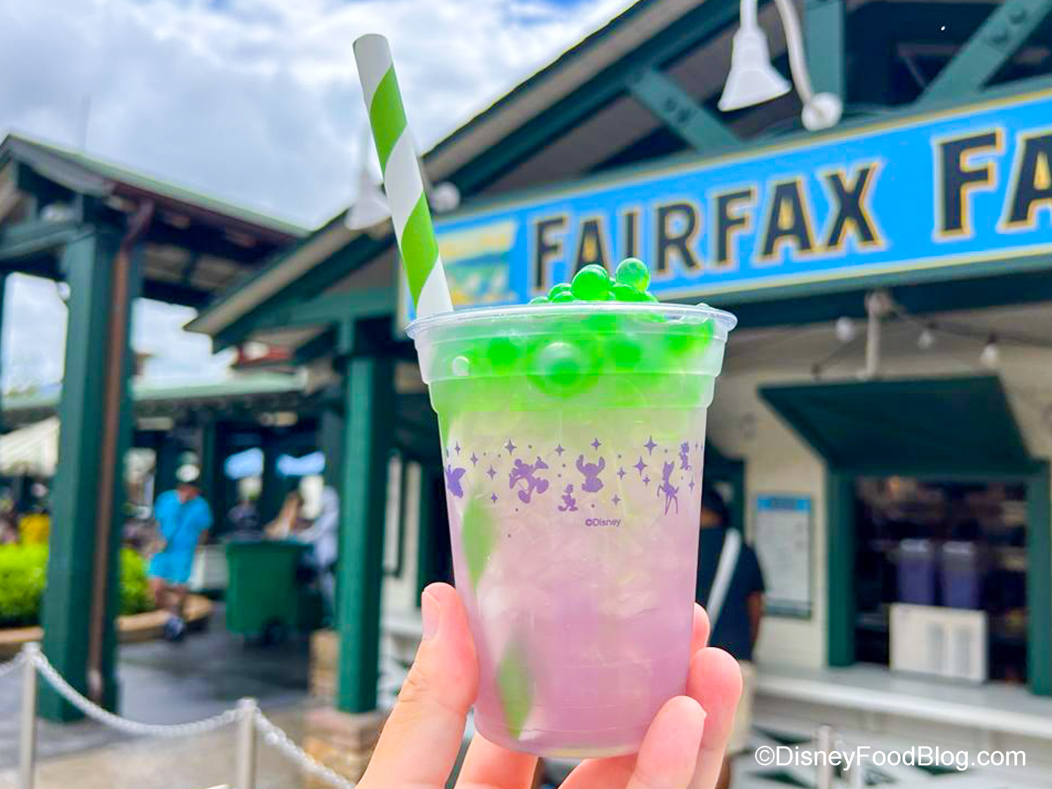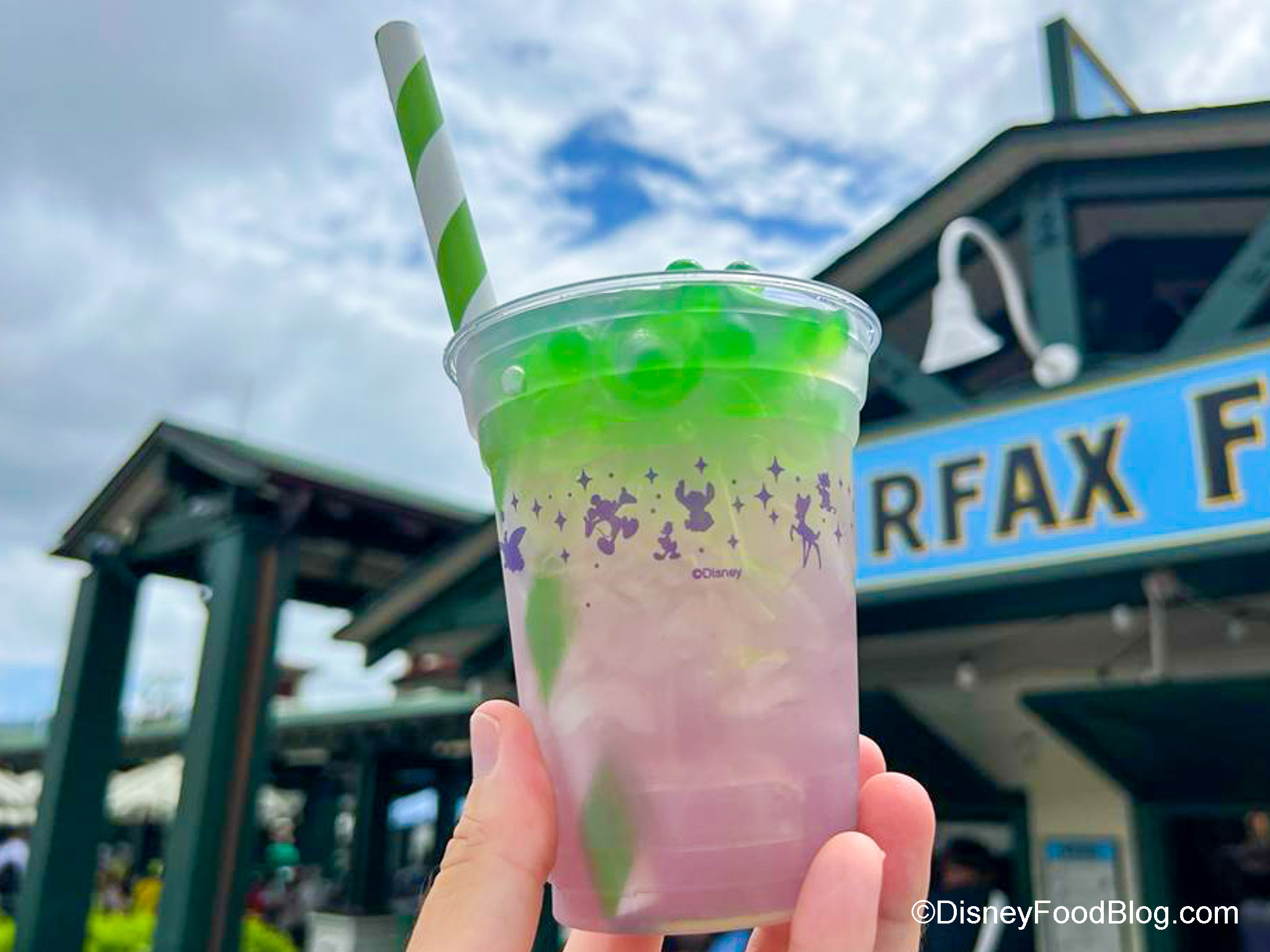 Now for something to drink. We headed over to Fairfax Fare in Hollywood Studios to try Bubbles of the Sea for $6.99. It’s made with Gold Peak Sweet Green Tea, Lemon Juice, Pineapple, and Guava topped with Boba Pearls and a splash of Shimmer. If you’re wondering, yes, this drink tastes just like liquid candy. It’s VERY sweet, but if you like sweet, you’ll love it.