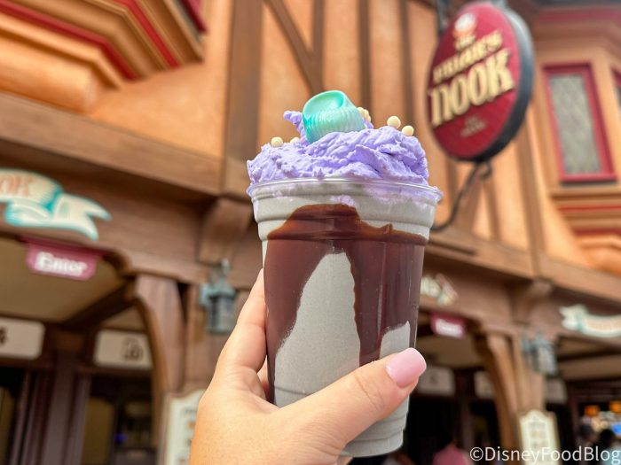 This treat consists of a cookies and cream milkshake with a chocolate drizzle and purple whip cream, topped with white chocolate crisp pearls, and a chocolate seashell. We picked this one up at The Friar’s Nook in Magic Kingdom for $7.99.