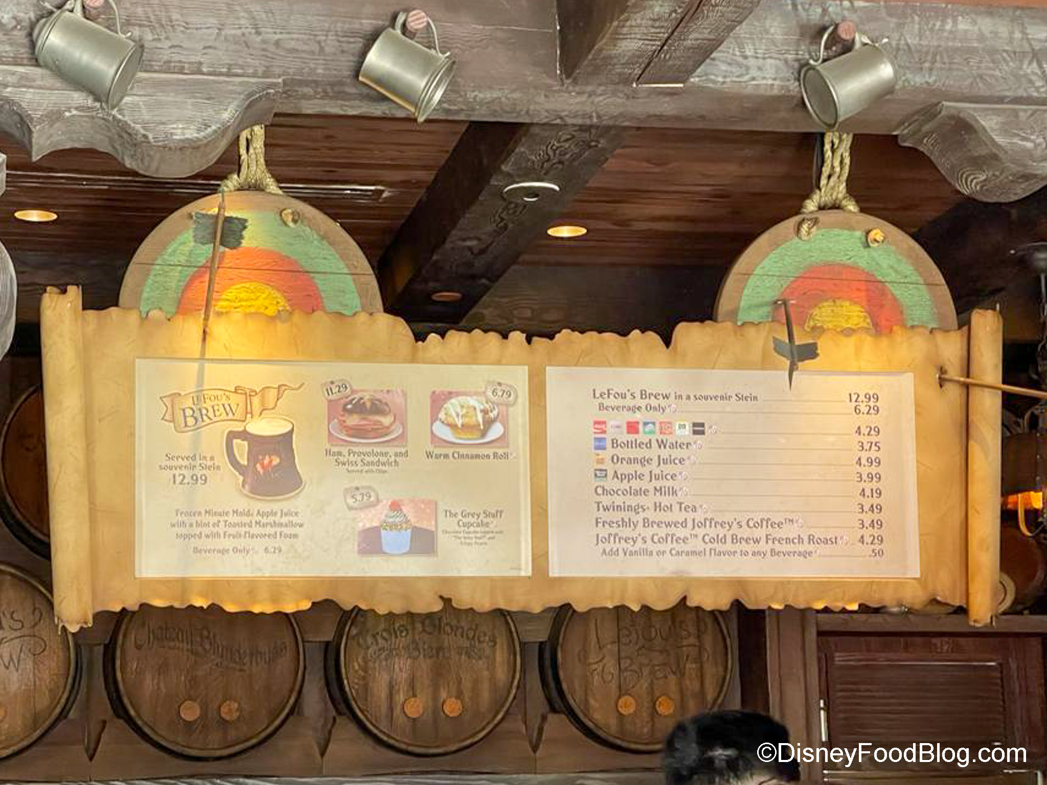 If you wander into Fantasyland, you can also get your coffee fix. Cheshire Cafe has Freshly Brewed Joffrey’s Coffee — both regular and decaf. You can add a flavored syrup (caramel or vanilla) for 50 cents extra.