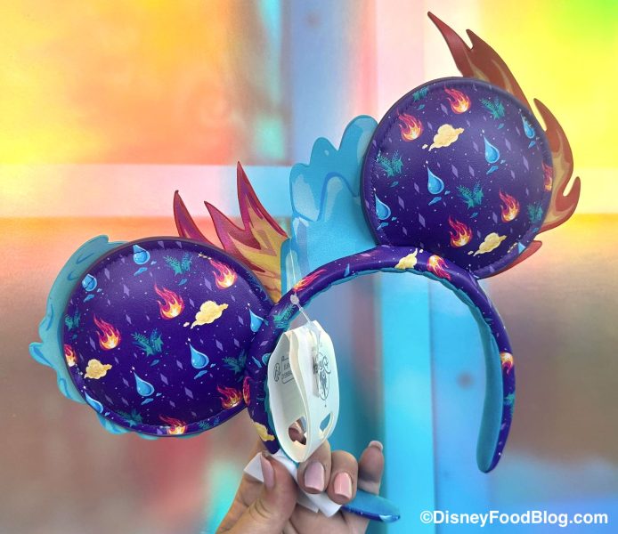 The first thing that caught our eye was the Elemental Ears, that star two of the main characters — Ember and Wade — on the front. Since the theme of the movie is centered around the elements, a flame and a wave are positioned in the center of the ears, right where lots of other designs have a bow instead.