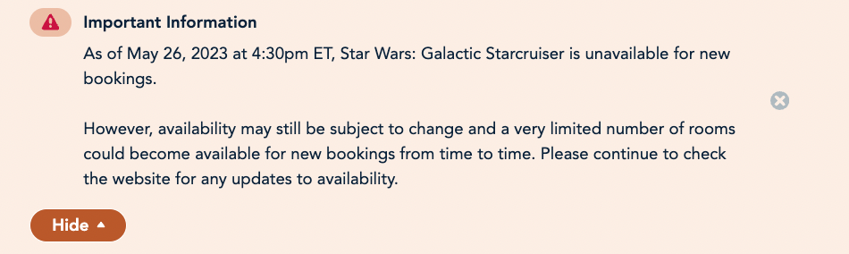 Reservations for the Starcruiser’s final voyage were marked “Unavailable” before booking reopened to the general public — that may be because Disney allowed guests with reservations AFTER the closure date to reschedule. There were some bookings available early on May 26th, but later, Disney shared a message on the Galactic Starcruiser website stating that the Star Wars Galactic Starcruiser is unavailable for new bookings.