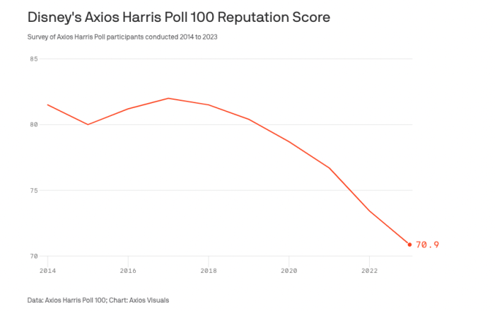Disney has actually “lost momentum across each of nine attributes measured in the Axios Haris 100 poll.” Its biggest declines were in citizenship (where people share if the company shares their values or supports good causes) and perceptions of future growth.