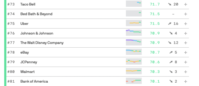 In 2022, Disney ranked 65th on the Axios Harris reputation list. In 2023, Disney has DROPPED to spot number 77. In 2022 they had a drop of 28 spots, this year it was a drop of 12 spots — so that is at least a less intense drop, but a drop nonetheless. Disney finds itself below brands like Taco Bell and Uber but above Walmart and Bank of America.