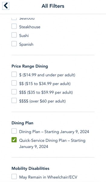 Right now, it looks like Disney has only released the Quick Service and Table Service locations, and not necessarily all the snack spots. We’ll be keeping an eye out for those! You can find which restaurants qualify by going to the main restaurant page on the Disney World website, and filtering by the Disney Dining Plan! Here’s what it looks like on the mobile website — just select “All Filters…”
